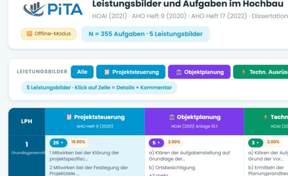 355 Grundleistungen aus 5 Leistungsbildern im Vergleich: Projektsteuerung (AHO), Objektplanung, TGA, Tragwerk und Brandschutz nach HOAI 2021. Interaktives Vergleichstool mit Kommentarfunktion. Ideal für Projektleitende und Büroleitende in der TGA-Planung.